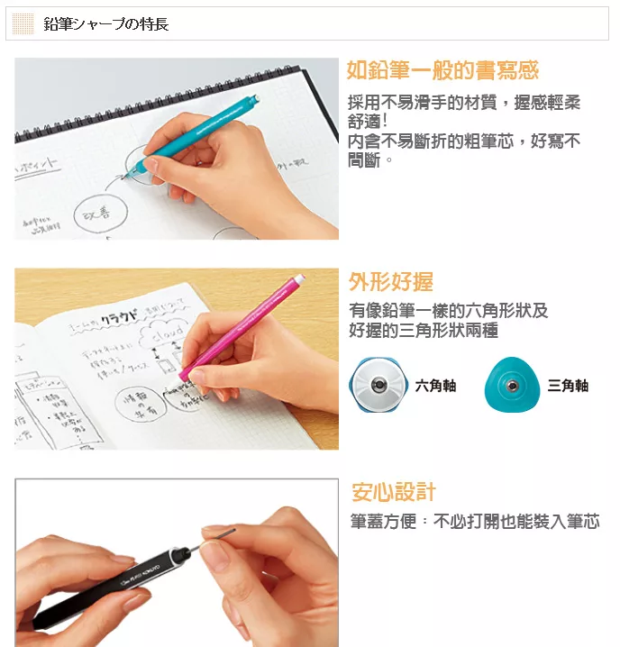 ◎握感如同鉛筆!?未添加任何熱塑性塑料,三角軸、六角軸的趣味造型,讓使用者誤以為自己在用一般鉛筆,握感自然舒適