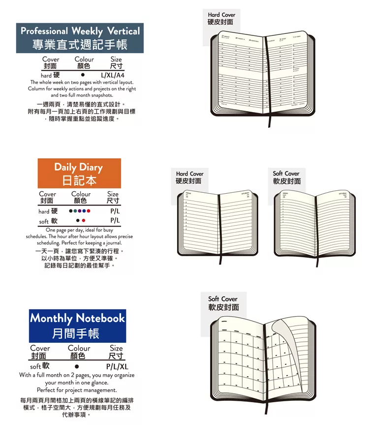 附有年曆、月曆、各國假日、時區表等內頁,讓您輕鬆安排未來的行程。